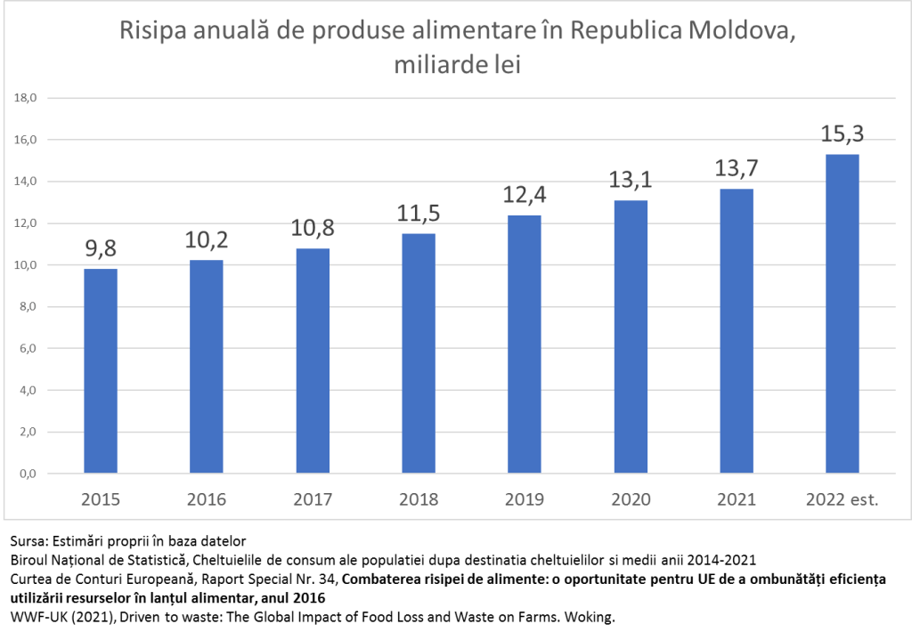 În acest an moldovenii vor cheltui pentru produse alimentare cel puțin 45 miliarde lei, iar 15-20% din toate produsele procurate nu mai ajung să fie consumate. Sunat aruncate drept la lada de gunoi. În jur de 8 miliarde lei cheltuiți pentru produsele alimentare, vor fi aruncați în acest an de către fiecare din noi, drept în lada cu gunoi. În sate o parte din produse merg pentru hrana animalelor, dar în orașe totul merge la gunoi. Iar în orașe, risipa este de circa două ori mai mare decât la sate. Toate estimările sunt realizate de mine în baza Raportului WWF-UK (vezi aici raportul)