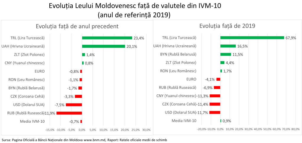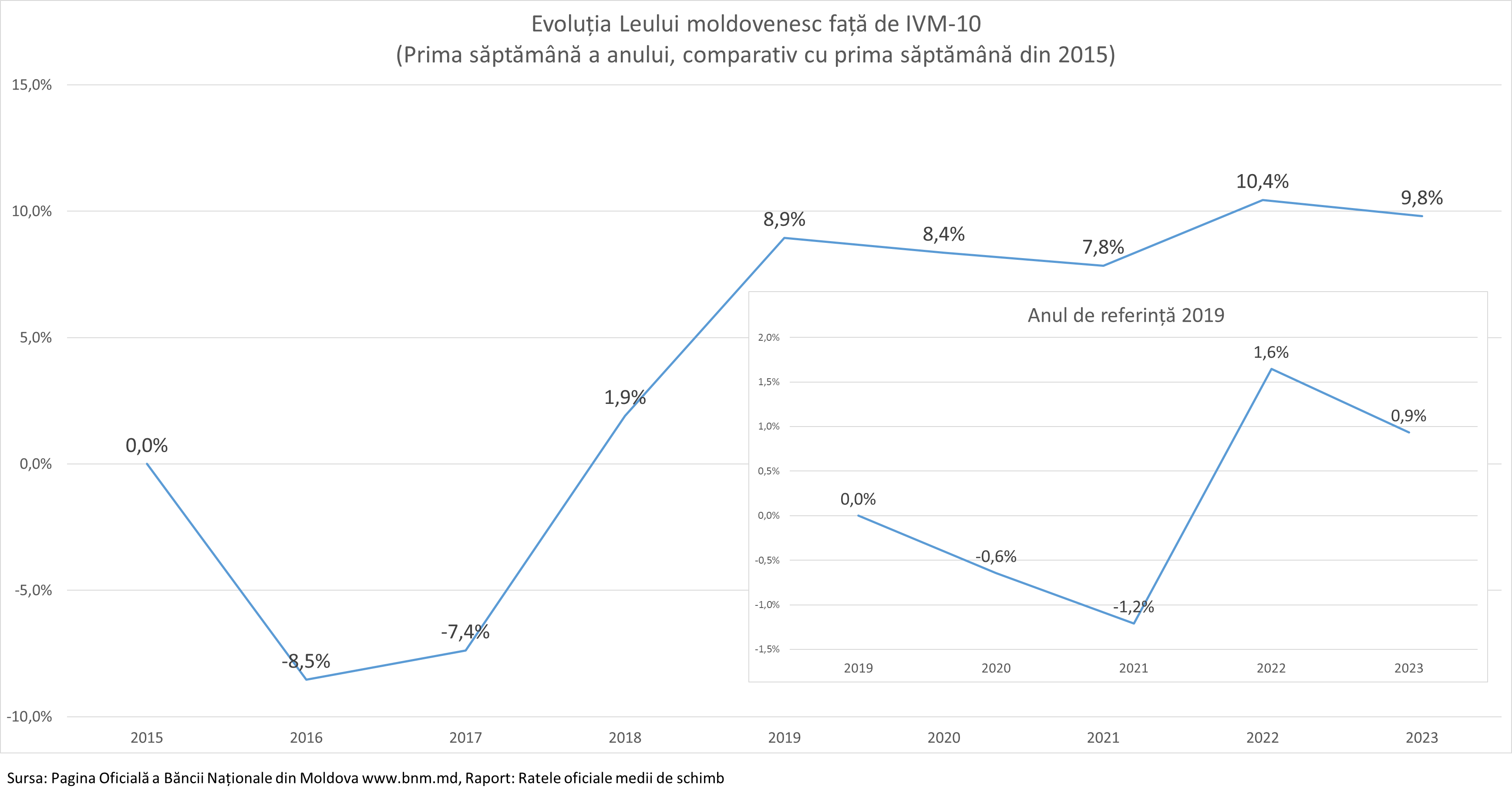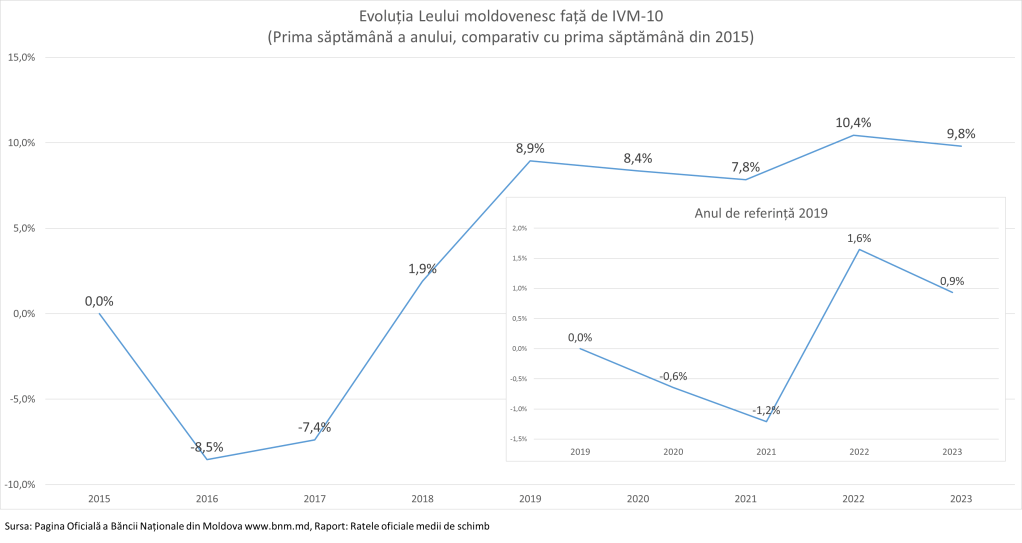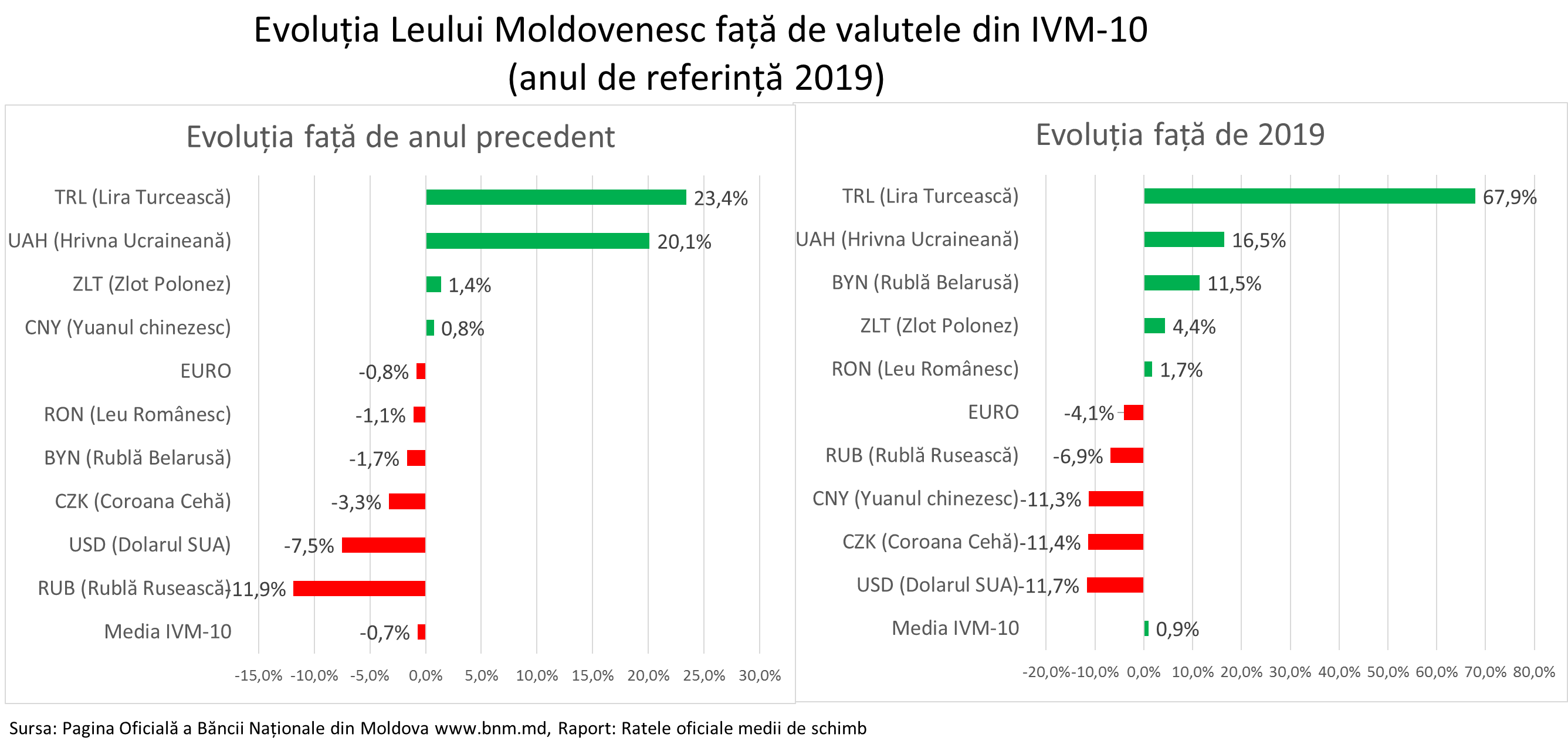 Astfel după fluctuațiile de depreciere, apoi apreciere din perioada 2015-2018, urmează o perioadă de stabilitate deja pe parcursul a 5 ani de zile. Comparativ cu cele 10 valute de bază ale principalelor parteneri comerciali ai Moldovei, leul începe anul aproximativ la același nivel. Se vede clar că din 2019 cursul mediu ponderat al leului moldovenesc oscilează nesemnificativ, iar în prezent este cu 0,7% mai jos decât anul trecut, dar cu 0,9% mai puternic față de 2019.