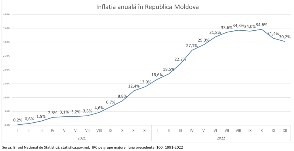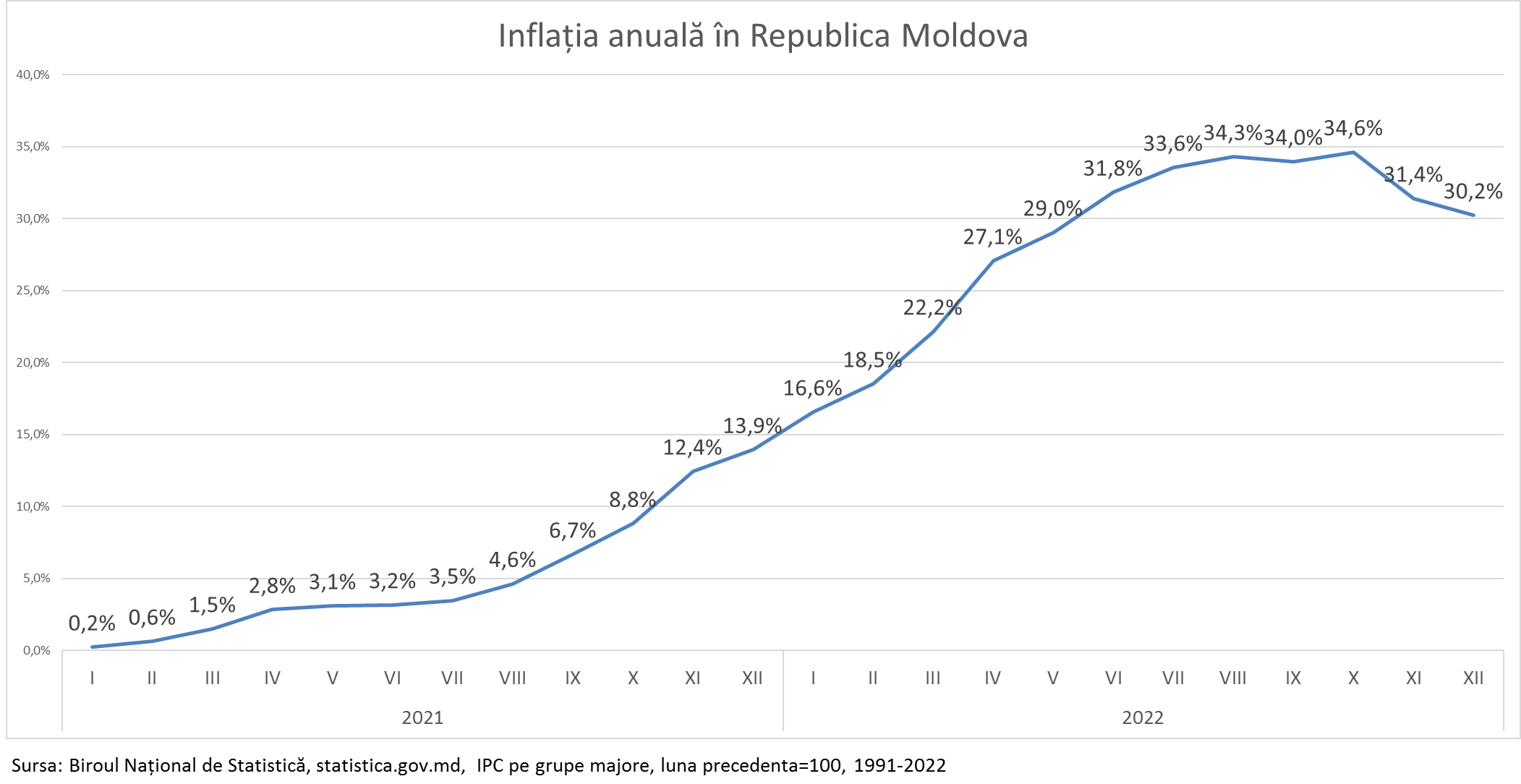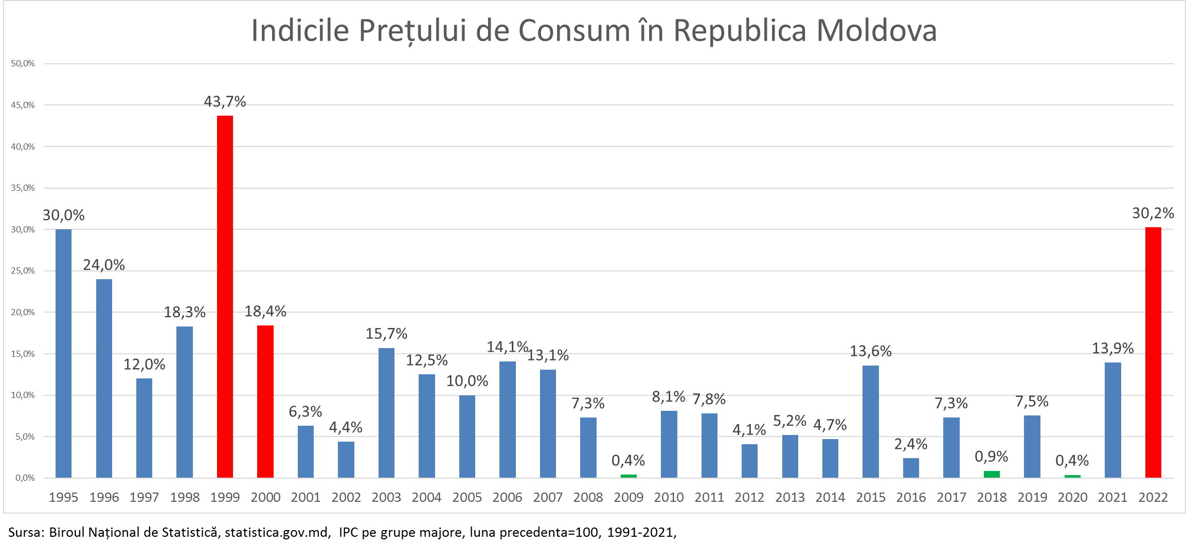 Acum deja putem constat că inflația în Moldova în 2022 a fost cea mai mare din ultimii 23 ani, precedentul anti-record a fost stabilit în 1988, an de criză, când inflația a ajuns la 43,7% anual.
