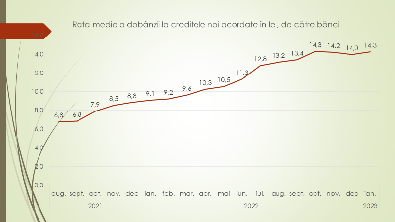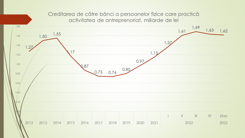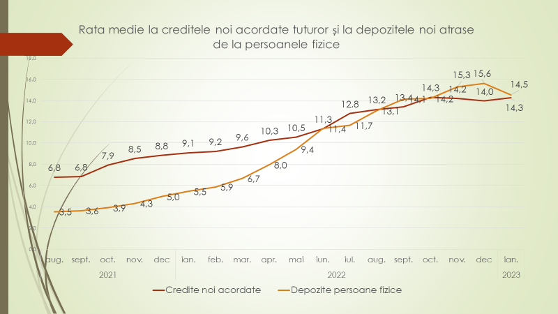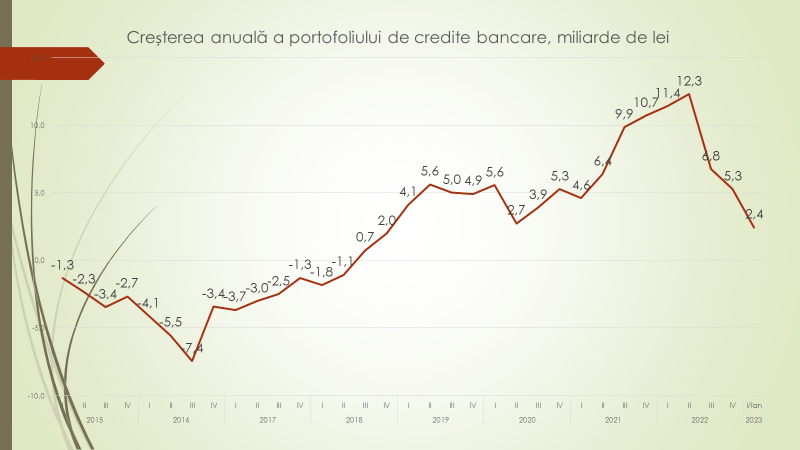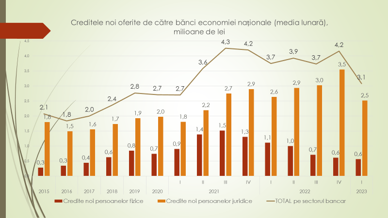 Economistul declară că portofoliul creditelor noi acordate lunar până în 2020 erau la nivel de 2,7 miliarde de lei. Din 2021, creditele noi acordate au înregistrat o creștere continuă, ajungând la 4 miliarde lei lunar, iar la început de 2023 volumul creditelor noi acordate a înregistrat o scădere semnificativă de până la 3,1 miliarde lei. Înăsprirea politicii monetare a afectat cel mai mult creditele noi acordate persoanelor fizice, care s-au redus de la 1,5 miliarde de lei lunar în 2021, trimestrul III, până la 600 de milioane de lei, astăzi. În același timp, volumul creditelor noi accesate de către mediul de afaceri, a crescut de la 2,7 miliarde de lei în 2021, media lunară, la 3,5 miliarde de lei lunar, în trimestrul IV din 2022.