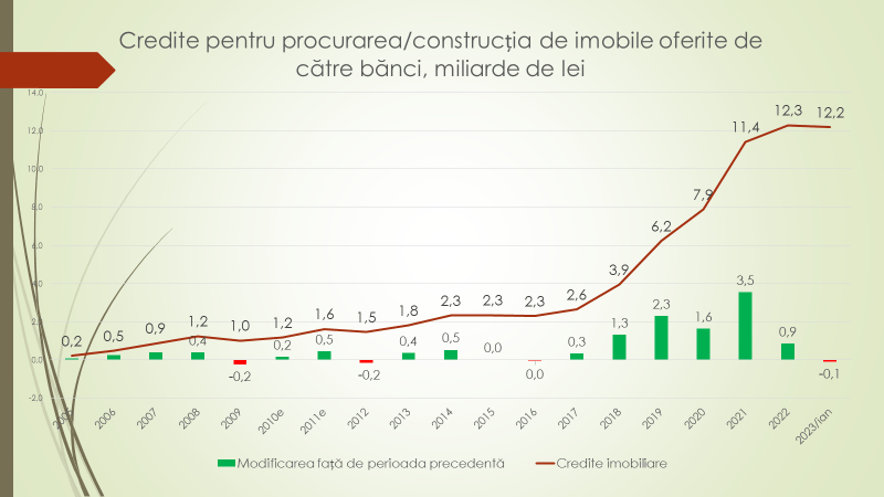Referitor la creditele imobiliare, expertul spune că din 2017 volumul creditelor ipotecare a crescut de 5 ori, de la 2,6 miliarde de lei în 2017 la 12,3 miliarde de lei în 2022.