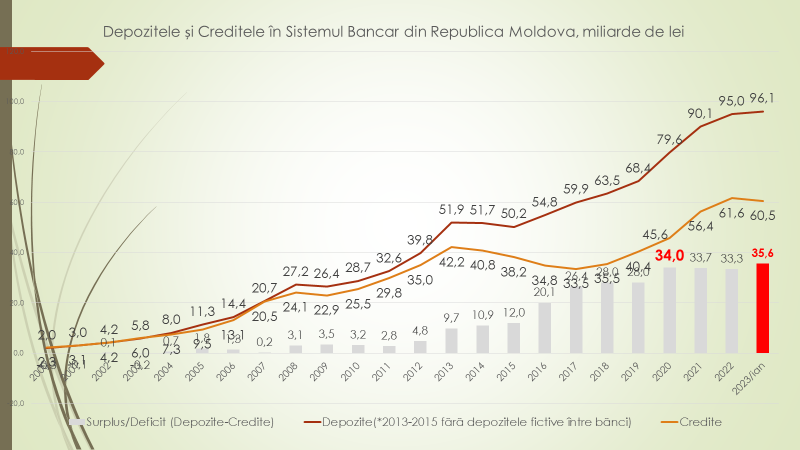 Veaceslav Ioniță spune că un element important al procesului de creditare îl are surplusul de lichidități din sistemul bancar. Diferența dintre banii depuși drept depozit la bănci de către cetățeni și agenții economici și creditele acordate acestora. Acest surplus până în 2010, 2011 era foarte mic. După jaful bancar din 2014, în Republica Moldova procedura de creditare a devenit mult mai rigidă, în special pentru mediu de afaceri. Astfel, depozitele au continuat să crească substanțial, în timp ce procesul de creditare a crescut mult mai lent. În 2020 erau aproape 80 de miliarde de lei sub formă de depozite în bănci și de doar 46 de miliarde de lei credite acordate. Surplusul de lichidități era de 34 de miliarde de lei. În 2022 situația sa îmbunătățit puțin, iar anul 2023 a început cu o reducere a volumului de credite și cu o creștere a depozitelor, cea ce a provocat majorarea de până la 35,6 miliarde de lei a surplusului de lichidități din bănci.