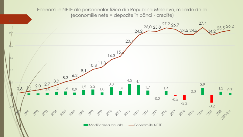 Referitor la volumul economiilor nete ale populației, banii oamenilor din bănci, minus creditele pe care le-au luat, economistul susține că acesta s-au redus dramatic. Populația a depus bani în bănci cu mult mai puțini decât au accesat credite. În 2022, inclusiv în ianuarie 2023, se înregistrează o tendință de recuperare. Politica BNM a încurajat populația să facă economii și să se crediteze mai puțin. În 2022 moldovenii au depus cu 1,33 de miliarde de lei mai mult în bănci, decât au luat credite. În ianuarie 2023, moldovenii au depus în bănci cu 700 de milioane de lei mai mulți decât au luat credite.