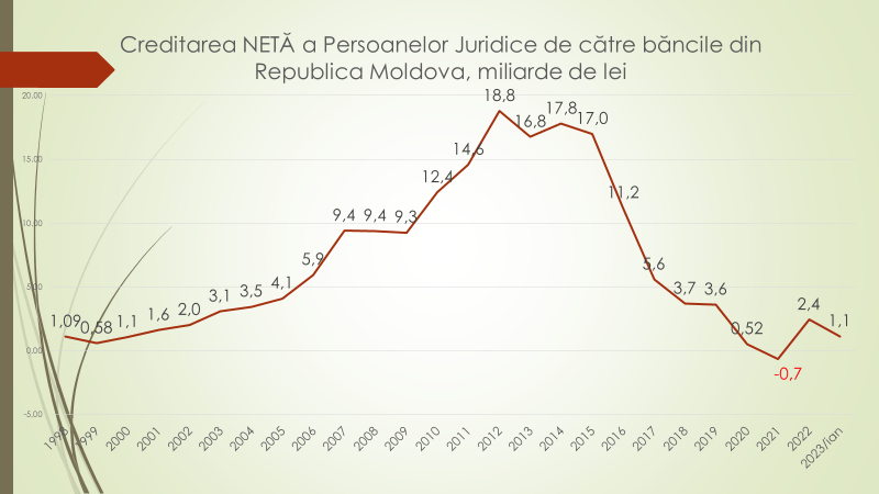Despre creditarea netă a businessului, creditele luate de către agenții economici, minus depozitele pe care le au în bănci, analistul economic a afirmat că până în 2018 creditarea netă a mediului de afaceri era de aproape 19 miliarde de lei. În 2021 aceasta a fost negativă, cea ce reflectă o stare extrem de proastă în economie. Oamenii de afaceri au ținut mai mulți bani în bănci decât au luat credite, iar băncile i-au dat oamenilor pentru consum. În 2013 businessul moldovenesc avea accesate credite de circa 37 de mii de lei, iar 20 de miliarde de lei erau depozite în bănci. În 2021 s-a ajuns că volumul creditelor pe care agenții economici l-a luat să fie de 33,5 miliarde de lei. Însă depozitele în bănci erau de 34,2 miliarde de lei.