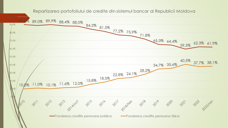 Potrivit expertului, prin reducerea volumului de creditare a populației și creșterea timidă a creditării agenților economici a fost rezolvat raportul de forțe dintre volumul de credite oferit mediului de afaceri și populației. 12 ani în urmă din tot portofoliul de credite acordat de către bănci 90% era accesat de către agenți economici, iar 10% de către populație. Situația s-a inversat după 2014, când mai mult de 40% din creditele acordate de către bănci au ajuns la populație, iar circa 60% la mediul de afaceri. În prezent, mediul de afaceri se creditează în proporție de 62%.