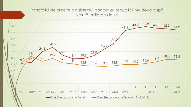 Esențial este, declară Veaceslav Ioniță, valuta în care se solicită și se acordă împrumuturile. Până în 2012 creditele în valută erau mai mari decât cele în lei. Ulterior, au crescut împrumuturile în lei. Din 2015 și până în 2022, portofoliul de credite în sistemul bancar a crescut exclusiv din contul creditării în lei. Creditele în valută au rămas stabile la 15-16 miliarde de lei. În trimestrul III și IV din 2022, din cauza că creditele în lei au devenit foarte scumpe, a fost înregistrată o reducere a volumului de credite în lei și o creștere semnificativă, de aproape 20%, a creditelor în valută.