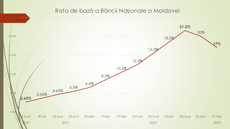 Economistul a amintit că, în 2020, Republica Moldova a avut cea mai mică rată de bază a BNM, de 2,65%. Acest fapt a dus ca la mijlocului lui 2021 să avem cei mai ieftini bani de împrumut, lucru care s-a manifestat prin creditarea fără precedent. În ultimul an și jumătate, BNM de zece ori a majorat rata de bază ajungând la 21,5%, ceea ce a dus la scumpirea creditelor și la creșterea depozitelor.