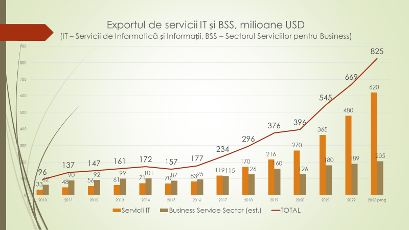 Expertul susține că sectorul serviciilor reprezintă economia secoului 21. Înregistrează cea mai rapidă creștere sectorul servicilor IT și BSS (sectorul serviciilor pentru business: proiectări, arhitectură, cercetări, contabilitate, relații cu clienții, sondaje, etc., în cazul cărora nu există legătura teritorială. De ex. poți fi în Republica Moldova și să oferi servicii de cercetare, contabilitate, companiilor din Germania). În 2022, volumul total al exporturilor de servicii IT și BSS a ajuns la 669 de milioane de dolari, creștere în mare parte bazată pe creșterea exporturilor serviciilor IT, care în 2022 au fost de 480 de milioane de dolari. Serviciile BSS exportate, pentru 2022, sunt estimate la 189 de milioane de dolari.