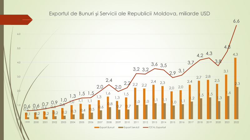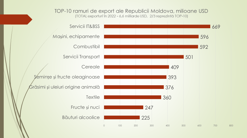 Analistul economic menționează că la cele 6,6 miliarde de dolari pe care le-a avut Republica Moldova anul trecut din exporturi, serviciile IT și BSS au contribuit cu 669 de milioane de dolari. Mașinile și echipamentele – cu 596 de milioane de dolari. Combustibilul – 592 de milioane de dolari. Serviciile de transport – 501 milioane de dolari. „Ramura serviciilor IT și BSS a devenit cea mai mare ramură de export a Republicii Moldova. Anul 2022 este anul când serviciile de IT și BSS, care zece ani în urmă nu existau practic, au ajuns cea mai mare ramură de export”, a menționat analistul economic.
