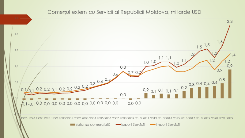 Economistul a afirmat că Republica Moldova are o balanță comercială negativă. Se exportă mai puțin decât se importă. În 2022, importul de bunuri a fost de peste 9 miliarde de dolari, fiind acoperit deficitul din balanța pozitivă cu servicii. Până în 2010 și în domeniul serviciilor era o balanță negativă. Se importa mai multe servicii decât se exporta. Din 2010 situația s-a schimbat. Cel mai mult s-a schimbat în 2022, când balanța a devenit pozitivă de 900 de milioane de dolari. „Noi am exportat servicii de 2,3 miliarde de dolari, dar am importat de 1,4 miliarde de dolari. Acești 900 de milioane de dolari ne-au permis să achităm importul de gaze, de produse petroliere, produse alimentare etc.. Cei care lucrează în ramura serviciilor ne salvează balanța comercială”, a afirmat economistul.