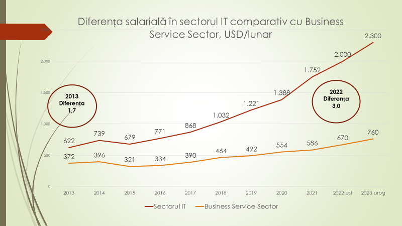 Expertul a mai declarat că serviciile IT a asigurat și creșterea salariilor în Republica Moldova. În 2022, salariul în sectorul IT a ajuns la 37414 lei, crescând cu peste 20%, pe când în alte domenii au crescut cu până la 15%. „Oamenii din domeniul IT foarte ușor pot pleca peste hotare, iar acest fapt a dus la aceea că aici salariul a crescut mai rapid. Dacă în 2013 diferența de salarizare dintre sectorul IT și media națională era de 2,1 ori, în 2022 s-a ajuns de 3,6 ori. Salariul în sectorul BSS este mai mare decât media națională, dar mai mic decât în sectorul IT. Spre deosebire de sectorul BSS, autoritățile au atras o atenție sporită sectorului IT. Au oferit facilități fiscale, au creat parcuri IT, lucru care a permis ca acest sector să se dezvolte rapid, inclusiv creșterea salarială. Sectorul BSS nu s-a bucurat de atenție din partea autorităților, chiar dacă este similar cu sectorul IT”, a declarat expertul.