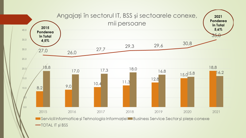 Economistul susține că în 2022, pentru prima dată salariul brut în domeniul IT a trecut de două mii de dolari, iar în sectorul BSS a ajuns la 670 de dolari. În aceste sectoare lucrează în prezent 35 de mii de persoane. „Republica Moldova trebuie și este obligată să intre în competiția globală nu doar în ceea ce privește exportul de bunuri, dar și în ceea ce privește exportul de servicii. Atunci când vorbim despre comerțul extern nu ar fi corect să nu vorbim despre exportul de servicii. El reprezintă 1/3 din toate exporturile moldovenești. Este unicul sector unde exportul și balanța comercială este pozitivă. El ne asigură intrările de valută necesare pentru a acoperi deficitul de balanță comercială de la importul de mărfuri. Ramura BSS și IT a devenit ramura de bază a economiei naționale. În această competiție globală, unde în prezent au intrat toate țările, și care se luptă pentru a acapara sectorul de servicii, este important ca Republica Moldova să nu piardă această competiție. Foarte ușor poate cetățeanul Republicii Moldova să lucreze aici acasă, pentru o companie din exterior. Unul dintre puținele sectoare unde poți oferi servicii în exteriorul țării fără a fi necesar ca forța de muncă să plece din țară”, a conchis economistul.