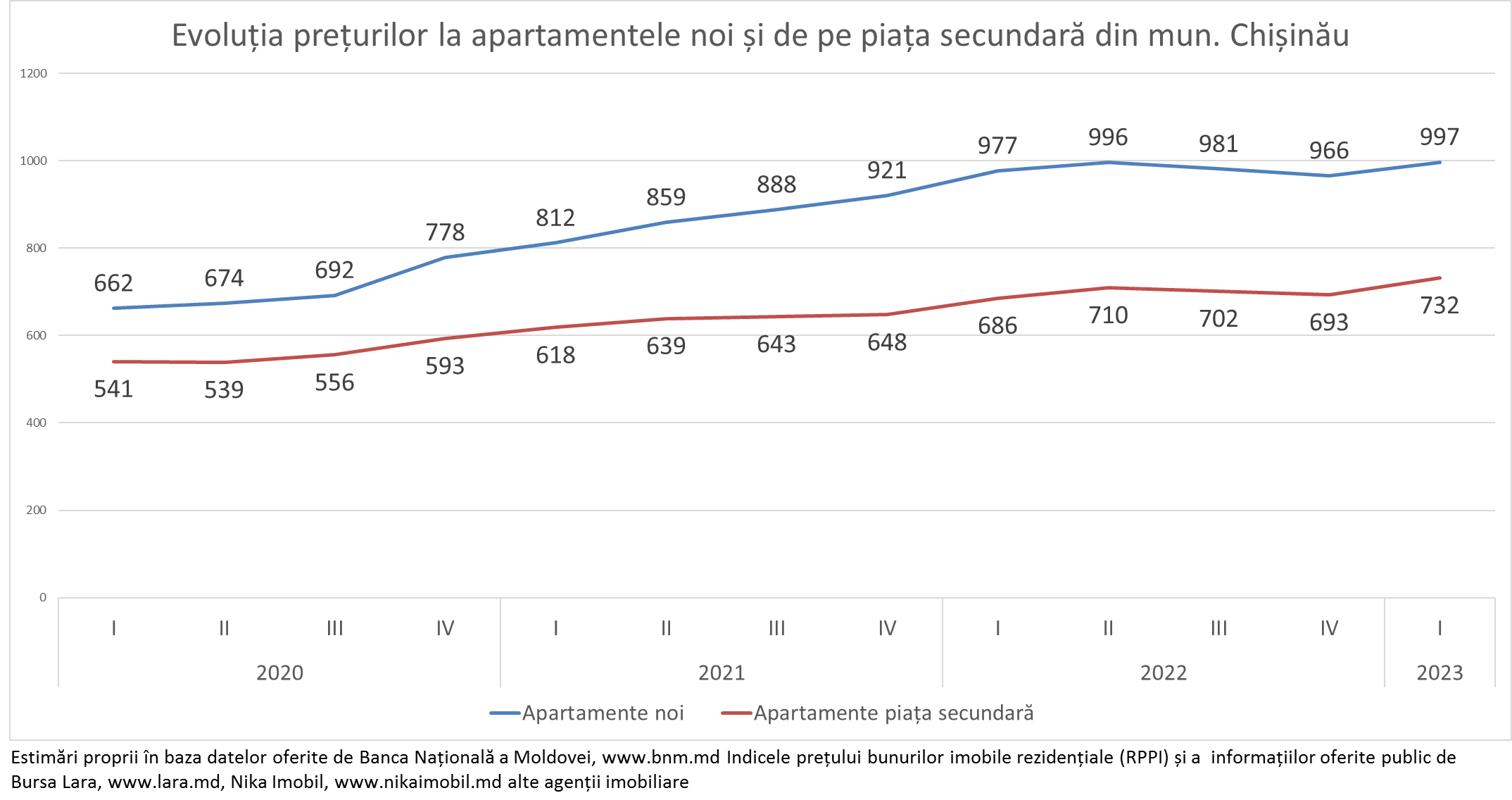 Prețurile la apartamente în mun. Chișinău timp de jumătate de an au stagnat la nivelul de 745 Euro/m2, iar în primul trimestru din 2023 au înregistrat o creștere de cel puțin 2,3% ajungând la 766 Euro/m2 de locuință.