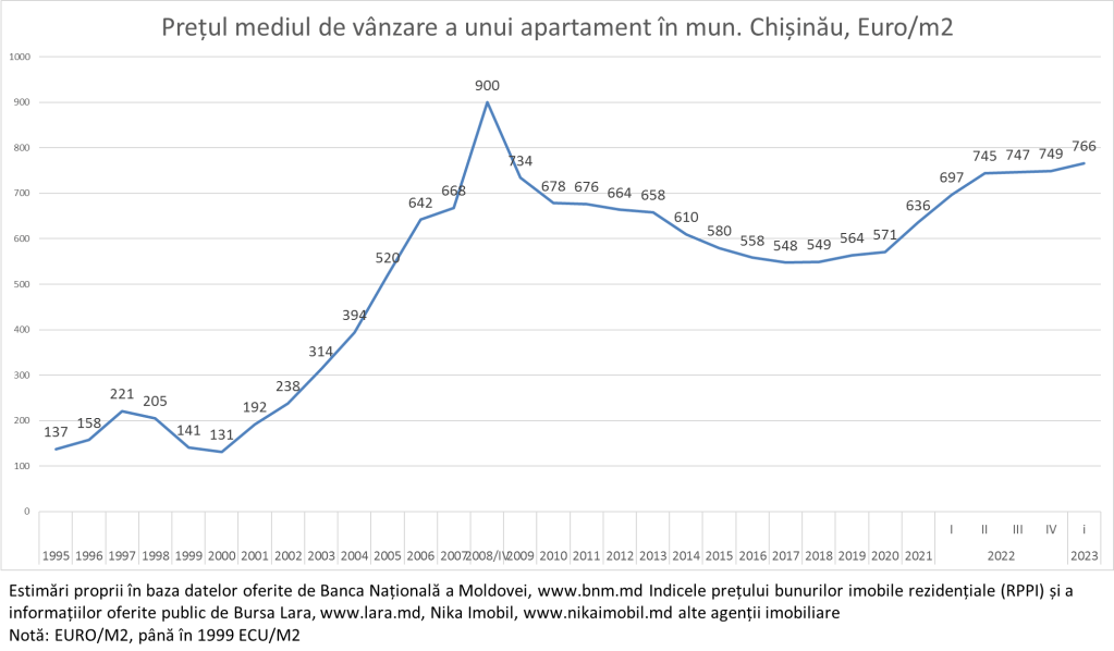 De fapt noțiunea corectă nu este creștere prețurilor, dar recuperarea lor, deoarece chiar și după o creștere semnificativă din 2021-2022, prețul mediu a unei locuințe în mun. Chișinău, încă nu a atins nivelul anului 2008, când un apartament se vindea cu 900 Euro/m2.