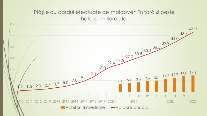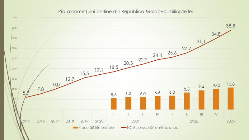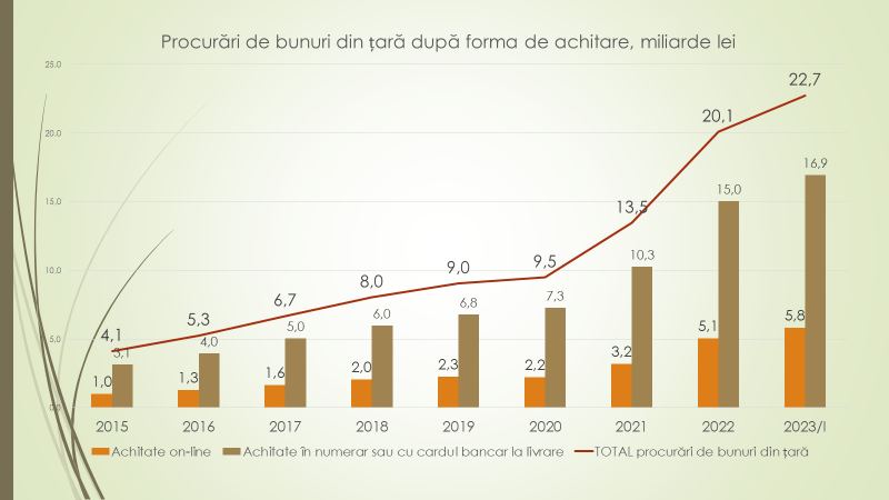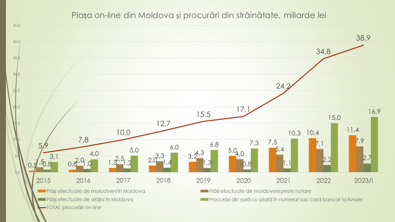 „În primul trimestru al anului curent, moldovenii au procurat online din țară bunuri în sumă de 22,7 miliarde de lei, față de 20,1 miliarde de lei în 2022 și față de 13,5 miliarde de lei în 2021. Din cele 22,7 miliarde de lei: 16,9 miliarde de lei au fost plata în numerar la cu cardul la livrare, iar 5,8 miliarde de lei au fost achitările online”, a menționat analistul economic.