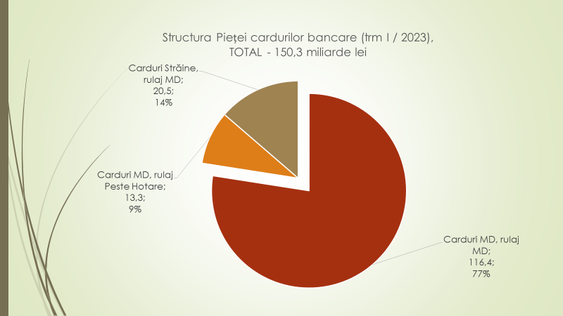 Potrivit expertului, în Republica Moldova piața cardurilor bancare este despre: 1) cardurile bancare moldovenești utilizate în interiorul țării; 2) cardurile bancare moldovenești utilizate peste hotare; și 3) cardurile bancare străine utlizate în Republica Moldova. Astfel, conform datelor Băncii Naționale a Moldovei (BNM), combinate cu datele sondajelor efectuate de către IDIS „Viitorul”, în primul trimestru din 2023 moldovenii au făcut tranzacții cu cardurile bancare în sumă de 150,3 miliarde de lei: cu cardul bancar moldovenesc în țară – de 116,4 miliarde de lei; cu cardul bancar moldovenesc peste hotare – de 13,3 miliarde de lei; cu cardul bancar străin în țară – de 20,5 miliarde de lei.