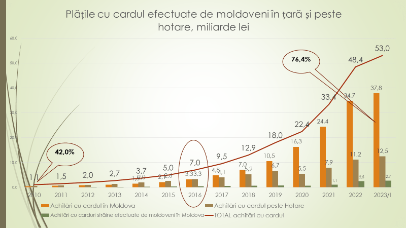 „Până în 2016 practic plățile efectuate cu cardul în Republica Moldova erau mai mici decât plățile efectuate cu cardul în străinătate. În prezent, 3 din 4 lei pe care moldovenii îi cheltuie cu cardul îi cheltuie în Republica Moldova și 25% peste hotare. În Republica Moldova, în prezent, domină achitările un numerar, atunci când se face o comandă online. În Republica Moldova, cele mai mari plăți care se fac, în prezent, se fac pentru achitarea facturilor și impozitelor”, a spus Veaceslav Ioniță.