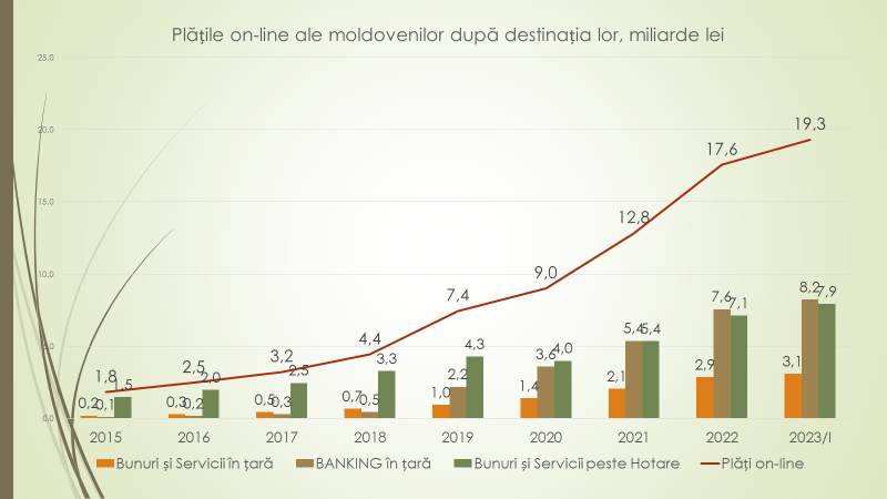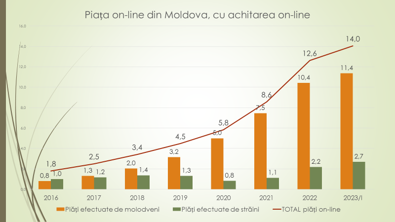 Despre piața online cu achitarea online, analistul economic a menționat că în primul trimestru din 2023 a fost de 14 miliarde de lei, față de 12,6 miliarde de lei în 2022 și față de 8,6 miliarde de lei în 2021. Din cele 14 miliarde de lei: 11,4 miliarde de lei au fost plățile efectuate de către moldoveni, iar 2,7 miliarde de lei – plățile efectuate de către străini.