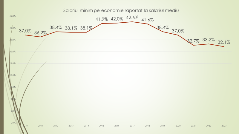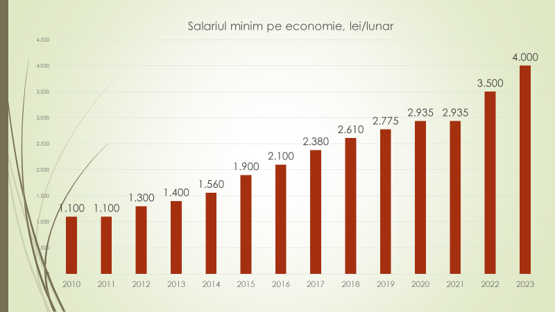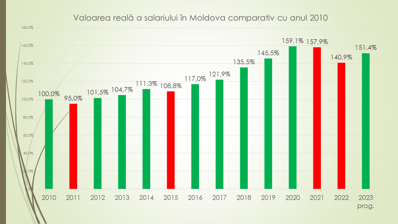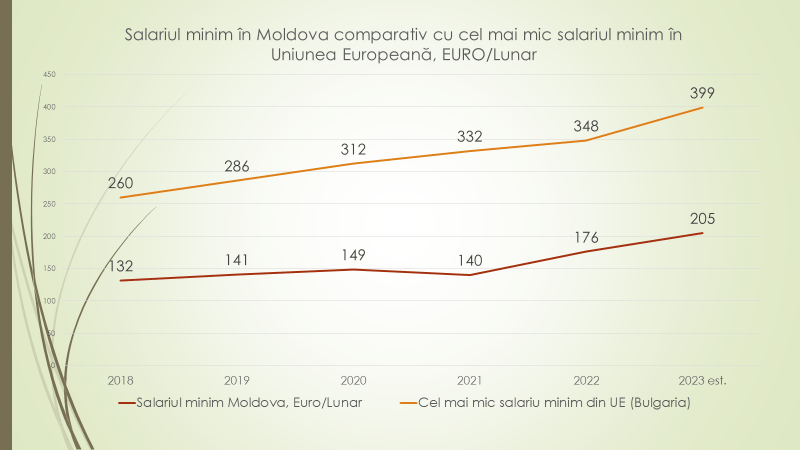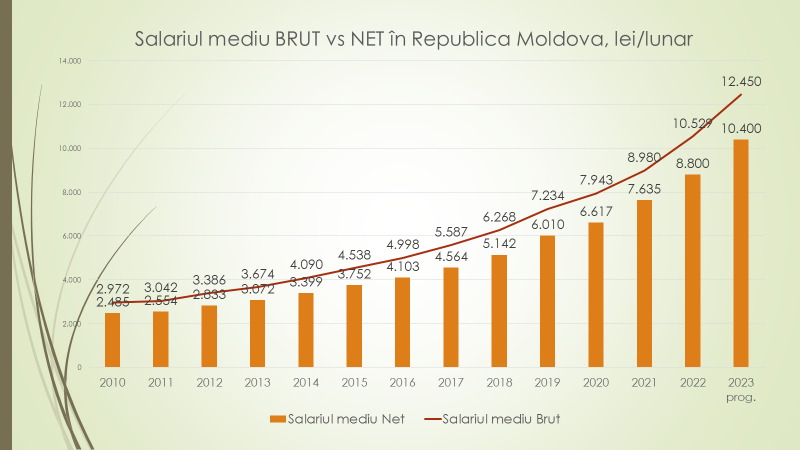 Potrivit expertului, în 2023 salariul minim pe economie în Republica Moldova este de 4000 de lei, față de 3500 în 2022 și față de 2935 în 2021. În 2010 era 1100 de lei, dar 10% din salariați primeau atunci circa 600 de lei, sub nivelul salariului minim pe economie, lucru care s-a menținut mulți ani. Salariul minim pe economie, din 2010 și până în 2015 era de circa 38% față de salariul mediu, în 2016 a urcat la 42%, iar în prezent este 32%. „Avem în Republica Moldova peste 600 de mii de salariați cu normă deplină. În 2018 salariul minim era 2600 de lei, iar salariul mediu, primit de către 10% cel mai prost plătiți angajați, circa 60 de mii de persoane, era de 1967 de lei. Până în 2020 salariul minim era mai mare decât salariul mediu al celor mai prost plătiți 10% salariați. Situația s-a îmbunătățit în 2019/2020 când diferența dintre salariul minim și salariul mediu a ajuns nesemnificativă. În acest an, 2023, salariul minim este de 4000 de lei, iar salariul mediu al circa 10% cel mai prost plătiți angajați va depăși 4400 de lei. Cu 10% mai mult decât salariul minim”, a spus expertul.