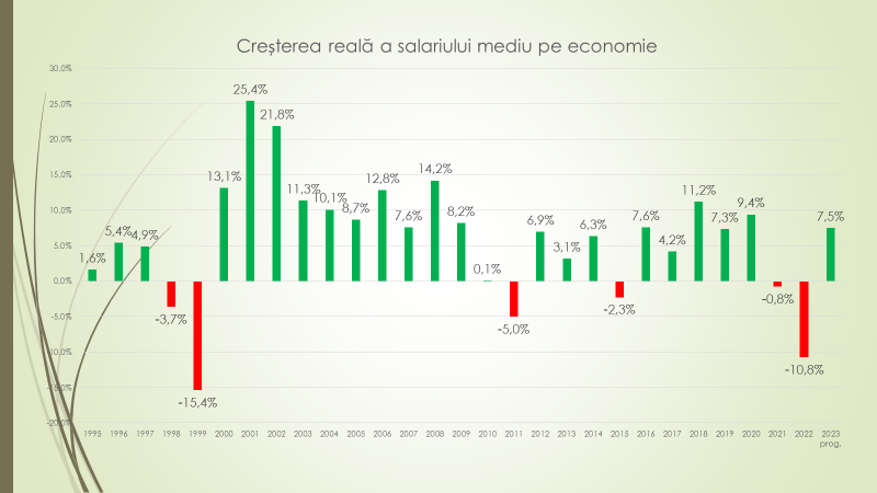 Analistul economic estimează că în 2023 salariul mediu pe economie va ajunge la 12450 de lei, în creștere cu aproape două mii de lei față de 2022, având în vedere că anii 2021 și 2022 au fost doi ani de criză, salariul real a scăzut în 2021 a scăzut cu 0,8% salariile, iar în 2022 cu 10,8%. „În 2023 salariul real, după puterea sa de cumpărare, în Republica Moldova va crește cu 7,5%, dar nu va ajunge încă la nivelul anului 2020. Din 1995, în ultimii 25 de ani, am avut șase scăderi de salarii, după puterea de cumpărare: în 1998/1999-cea mai puternică scădere reală a salariului de -19,1%, și în 2021/2022 – de -11,6%. Chiar dacă în 2023 vom avea o creștere de 7,5% nu vom reuși să recumperăm căderea din 2021/22. Cel mai probabil nivelul anului 2020 îl vom atinge în 2024”, a estimat analistul economic.