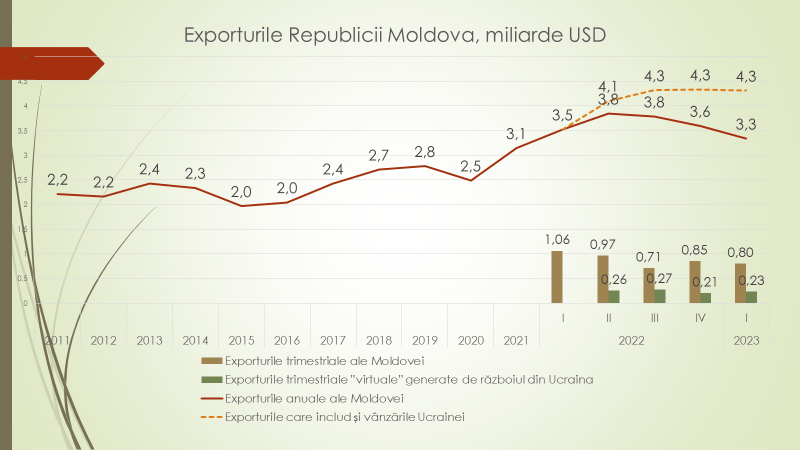 Veaceslav Ioniță a precizat că exporturile moldovenești scad pentru al treilea trimestru consecutiv. Acestia au crescut până la 4,3 miliarde de dolari, în valoare anuală, în trimestrul III din 2022, iar acum stau pe loc, fără nici o schimbare. În realitate, consideră Veaceslav Ioniță, exporturile moldovenești au scăzut. Un miliard de dolari din export este unul virtual, apărut pe fundalul războiului din Ucraina. A fost o creștere a exporturilor de produse petrolire către Ucraina. „Trebuie să ne îngrijoreze, deoarece este un trend descendent al exporturilor și în cea mai mare parte scade datorită producției agricole în scădere. Plouă – a vem producție agricolă pentru a exporta, nu plouă – nu avem producție agricolă pentru a exporta”, a precizat Veaceslav Ioniță.