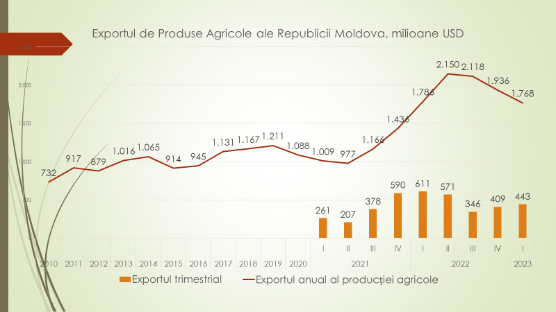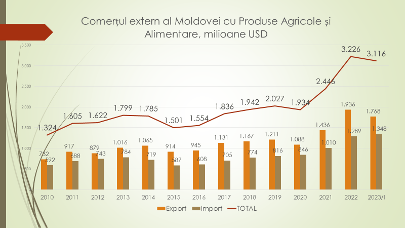 Expertul a mai declarat că volumul comerțului extern al Republicii Moldova cu producția agricolă până în 2020 a fost puțin peste 1,9 miliarde de dolari. Exporturile erau de 1,2 miliarde de dolari, iar importurile – de 846 de milioane de lei. Către 2022, volumul comerțului extern a ajuns la aproape 3,2 miliarde de dolari, dintre care exporturile puțin peste 1,9 miliarde de dolari, iar importurile puțin peste 1,2 miliarde de dolari. În acest an, în primele trei luni, volumul comerțului extern este estimat la aproape 3,1 miliarde de dolari, fiind în scădere exporturile, ajungând la puțin peste 1,7 miliarde de dolari, iar importurile au crescut până la puțin peste 1,3 miliarde de dolari.