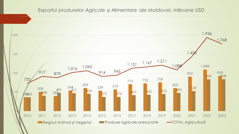 Potrivit lui Veaceslav Ioniță, exporturile în 2022 au fost de 1,9 miliarde de dolari, față de 1,4 miliarde de dolari în 2021. Exportul de produse din regnul animal și vegetal a fost de 1,09 miliarde de dolari în 2022, față de 907 milioane de dolari în 2021. Produsele agricole prelucrate au fost exportate în 2022 în valoare de 839 de milioane de lei, față de 529 de milioane de lei în 2021.