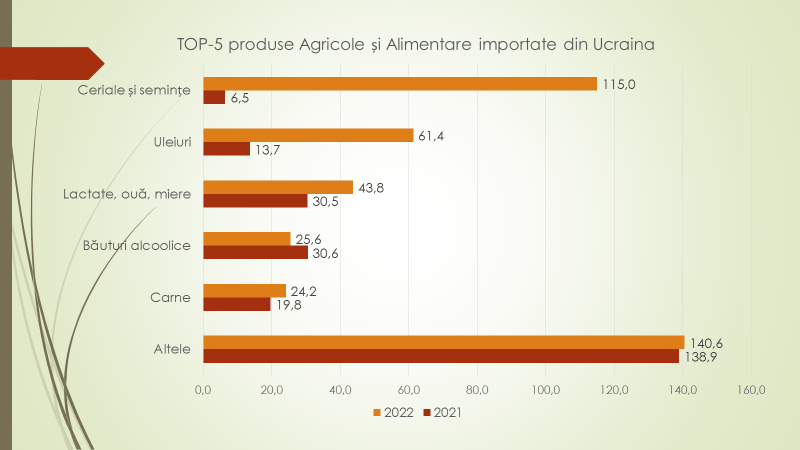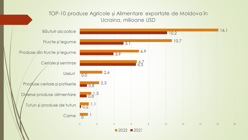 Analistul economic menționează că produsele agricole și alimentare exportate de către Republica Moldova în Ucraina în 2022 au fost: băuturile alcoolice în proporție de 16,1 milioane de dolari; fructele și legumele – 10,7 milioane de dolari; produsele din fructe și legume – 6,9 milioane de dolari; cerialele și semințele – 6,7 milioane de dolari; uleiuri – 2,6 milioane de dolari. Importurile Republicii Moldova din Ucraina, în 2022, au fost despre: ceriale și semințe de 115 milioane de dolari; uleiuri – 61,4 milioane de dolari; lactate ouă, miere – 43,8 milioane de dolari; băuturi alcoolice – 25,6 milioane de dolari, carne – 24,2 milioane de dolari. „Tot ce s-a întâmplat la noi în relația cu Ucraina este creșterea masivă a grăunțoaselor, dar nu toate rămân aici, doar o parte, restul pleacă mai departe. Republica Moldova are capacități slabe de export. În 2022, comparativ cu 2021, au crescut semnificativ exporturile către Ucraina. Avem un potențial de creștere la exportul aproape la toate categoriile”, menționează analistul economic.