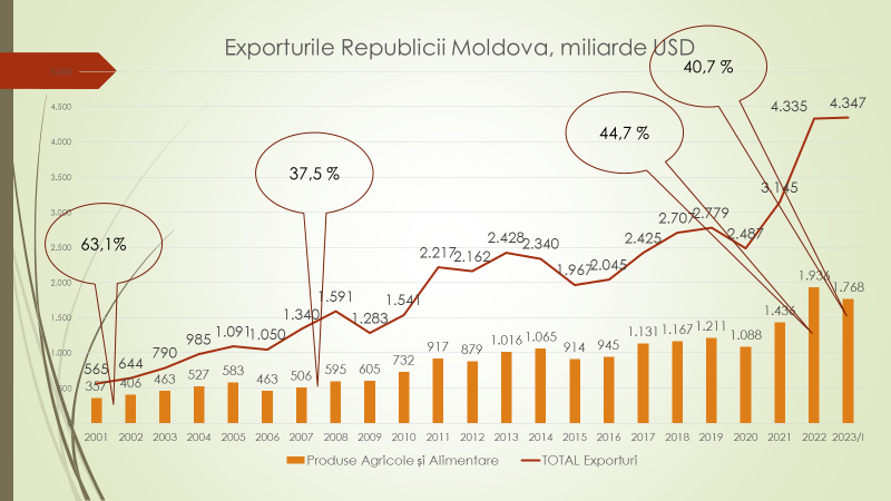 Expertul a mai declarat că volumul comerțului extern al Republicii Moldova cu producția agricolă până în 2020 a fost puțin peste 1,9 miliarde de dolari. Exporturile erau de 1,2 miliarde de dolari, iar importurile – de 846 de milioane de lei. Către 2022, volumul comerțului extern a ajuns la aproape 3,2 miliarde de dolari, dintre care exporturile puțin peste 1,9 miliarde de dolari, iar importurile puțin peste 1,2 miliarde de dolari. În acest an, în primele trei luni, volumul comerțului extern este estimat la aproape 3,1 miliarde de dolari, fiind în scădere exporturile, ajungând la puțin peste 1,7 miliarde de dolari, iar importurile au crescut până la puțin peste 1,3 miliarde de dolari.