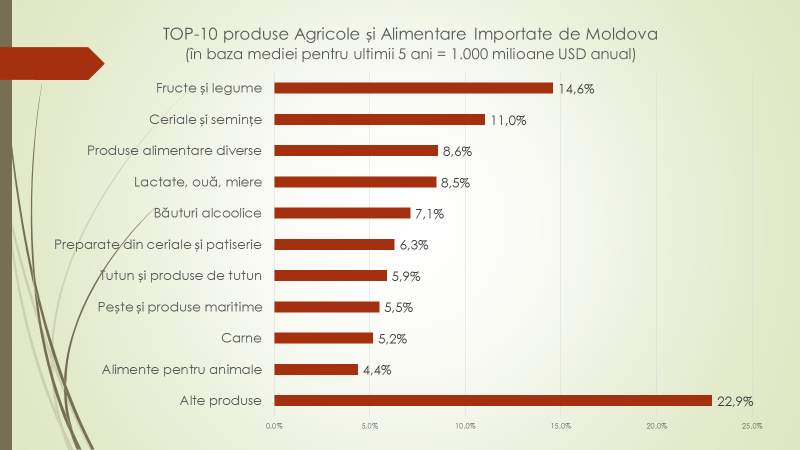Referitor la topul celor zece produse agricole și alimentare importate de către Republica Moldova, a declarat că media pentru ultimii cinci ani este: fructe și legume – 14,6%; ceriale și semințe – 11%; produse alimentare diverse – 8,6%; lactate, ouă, miere – 8,5%; băuturi alcoolice – 7,1%.