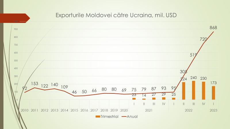 Veaceslav Ioniță spune că volumul comerțului extern al Republicii Moldova cu Ucraina era anual la nivel de 600-650 de milioane de dolari. La sfârșitul trimestrului întâi din 2023 a ajuns la 1,8 miliarde de dolari. 95% din creștere s-a datorat majorării exportului de produse moldovenești către Ucraina. „Noi din Ucraina am avut întotdeauna importuri masive. Importam de șapte ori mai mult decât exportam. În 2021, exporturile noastre către Ucraina erau la nivel de 80 de milioane de dolari, importurile – 600-700 milioane de dolari. După începerea războiului, au început să crească exporturile moldovenești către Ucraina. De la 95 de milioane de dolari în primul trimestru din 2022 la 868 de milioane de dolari în primul trimestru din 2023. Cel mai mult ce exportăm în Ucraina sunt produsele petroliere. Deoarece noi putem exporta produse petroliere în Ucraina companiile petroliere de la noi rezistă. Profiturile pe care le obțin exportând produse petroliere în Ucraina le permit să activeze”, a spus Veaceslav Ioniță.