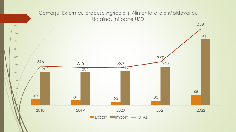 Analistul economic menționează că produsele agricole și alimentare exportate de către Republica Moldova în Ucraina în 2022 au fost: băuturile alcoolice în proporție de 16,1 milioane de dolari; fructele și legumele – 10,7 milioane de dolari; produsele din fructe și legume – 6,9 milioane de dolari; cerialele și semințele – 6,7 milioane de dolari; uleiuri – 2,6 milioane de dolari. Importurile Republicii Moldova din Ucraina, în 2022, au fost despre: ceriale și semințe de 115 milioane de dolari; uleiuri – 61,4 milioane de dolari; lactate ouă, miere – 43,8 milioane de dolari; băuturi alcoolice – 25,6 milioane de dolari, carne – 24,2 milioane de dolari. „Tot ce s-a întâmplat la noi în relația cu Ucraina este creșterea masivă a grăunțoaselor, dar nu toate rămân aici, doar o parte, restul pleacă mai departe. Republica Moldova are capacități slabe de export. În 2022, comparativ cu 2021, au crescut semnificativ exporturile către Ucraina. Avem un potențial de creștere la exportul aproape la toate categoriile”, menționează analistul economic.