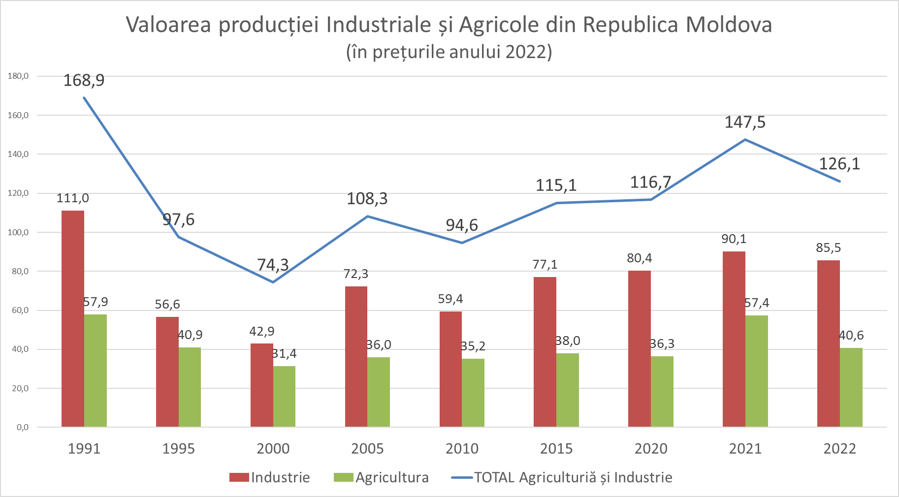 În prețurile anului 2022, volumul producției a fost cu 25% mai mică decât în anul 1991, când acest indicator a fost de 168,9 miliarde lei la valoarea banilor din prezent.