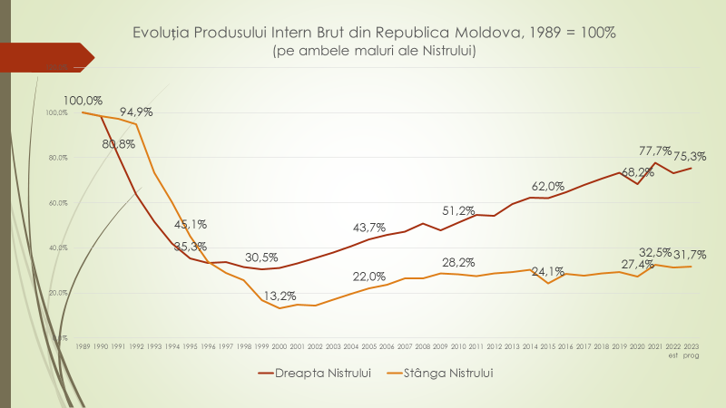 Produsul Intern Brut (PIB). Dacă PIB-ul malului drept al Nistrului s-a prăbușit imediat după destrămarea URSS, în stânga Nistrului a fost stat stabil până în 1993. Această senzație artificială spunea că la ei lucrurile stau mai bine. În 1997/1998, PIB-ul malului drept s-a stabilizat la 30% față de cel din 1989, iar în stânga Nistrului a ajuns, după o încercare nereușită de al menține artificial, la doar 13% față de cel 1989. „Au sperat că URSS îi va mai slava cumva. Noi am înțeles că URSS nu se mai întoarce, dar ei au trăit cu această speranță. Astăzi, anul 2023, PIB-ul malului drept s-a recuperat la nivel de 75% din valoarea celui din 1989, iar pe malul stâng este la nivel de 32% din valoarea anului 1989”.