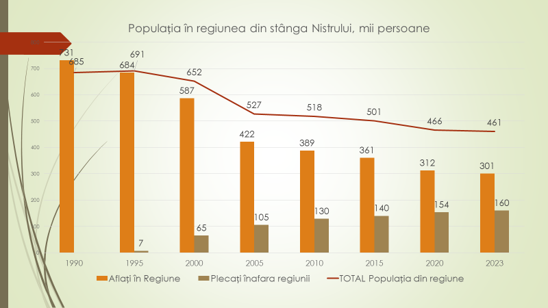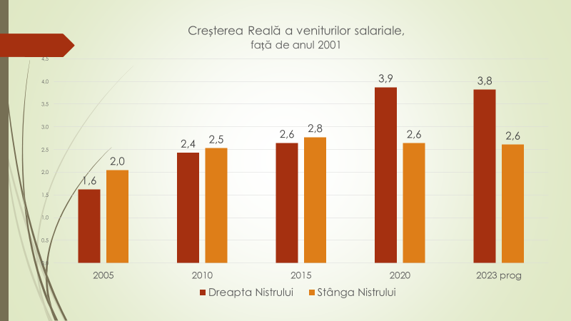Bunăstarea populației. În 2005, în regiunea separatistă transnistreană, față de 2001, creșterea veniturilor salariale a fost de 2 ori, pe malul drept al Nistrului – de 1,6 ori. În 2015, peste Nistru era de mai mare de 2,8 ori, pe malul drept – de 2,6. După 2015, lucrurile au început a se schimba brusc. Către 2020, pe malul drept, bunăstarea popilației era mai mare față de 2001 de 3,9 ori, iar pe malul stâng – de 2,6 ori. În acest an, pentru cetățenii de pe malul drept, bunăstarea lor față de 2001 va fi mai bună de 3,8 ori, iar a celor din stânga Nistrului stagnează la o creștere de doar 2,6 ori.
