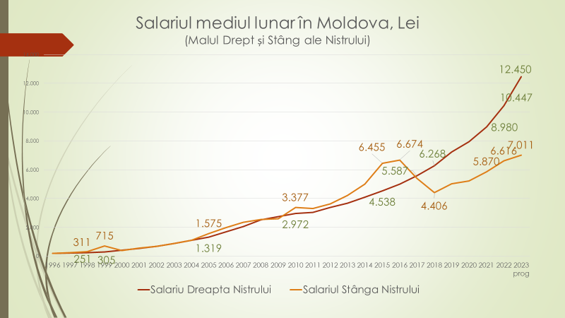 Salariul. În 1999 salariul pe malul drept era de 305 lei, pe malul stâng – de 715 lei. A fost așa până în 2016, când au rămas fără rezerve valutare și au avut loc mai multe fenomene negative care au dus la înrăutățirea situației. „Anul 2016 este anul în care „povestea de succes” a regiunii separatiste transnistrene s-a terminat. În acest an, 2023, salariul în Republica Moldova va fi cel mai probabil 12450 de lei, în regiunea separatistă transnistreană – 7000 de lei. În fiecare an crește discrepanța salarială. Acum e 60% diferența. Începând cu 2015, autoritățile autoproclamate de la Tiraspol, nu mai pot menține tempoul și nu mai pot asigura salariul minimum ca la noi și crește discrepanța salarială”.
