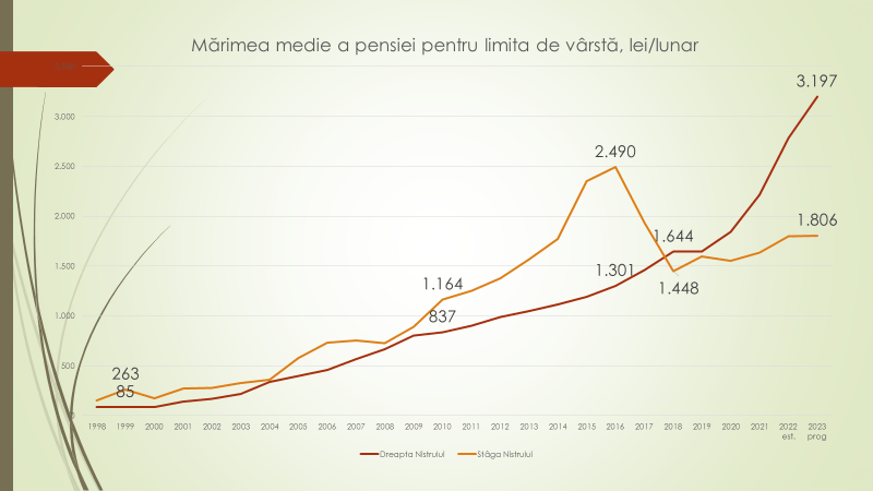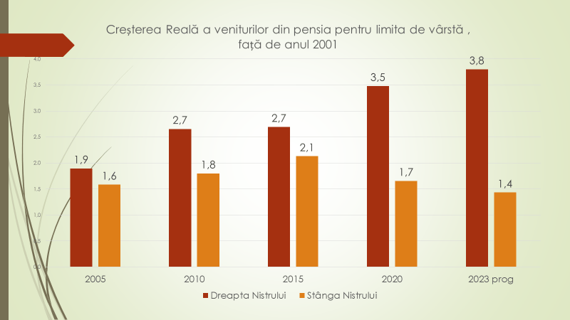 Creșterea reală a pensiei. Către 2005, pe malul drept, după câțiva ani în care pensia a fost foarte mică, a început a crește. Față de 2001, către 2010, bunăstarea pensionailor a crescut de 2,7 ori, în stânga Nistrului era 1,8 ori. Până în 2015, real pensia nu a crescut timp de 5 ani pe malul drept, în stânga Nistrului a crescut puțin. Până în 2020, malul drept a avut o creștere reală a pensiei de 3,5 ori față de 2001, iar regiunea separatistă transnistreană – de 1,7 ori, fiind înregistrată o cădere a bunăstării pensionarilor. „Astăzi, bunăstarea pensionarilor de pe malul drept al Nistrului este mai bună față de 2001, de 3,8 ori, a celor din stânga Nistrului de 1,4 ori. Din 2016, pensia în stânga Nistrului este într-o cădere continuă”.