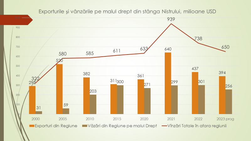Exporturile și vânzările pe malul drept al Nistrului. Până în 2010, stânga Nistrului pe malul drept aproape că nu vindea nimic. Totul mergea la export. După 2010, pe malul drept brusc au crescut procurările din stânga Nistrului, în special energia electrică. În 2022/2023 vânzările regiunii separatiste transnistrene, în afara regiunii, au scăzut puternic, de la 939 de milioane de dolari în 2021, la 650 de milioane de dolari în 2023. „Ceea ce îi salvează este dreapta Nistrului. Datorită nouă, 40% din tot ce vând ei este pe malul drept. Peste 80% din toate vânzările regiunii sunt pe malul drept al Nistrului, UE și Ucraina. 5% din tot ce vând se duce în Federația Rusă”.