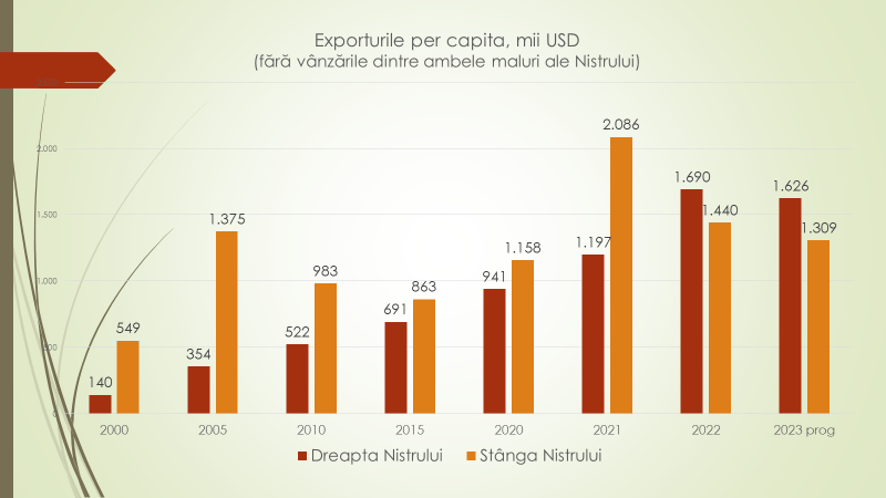 Exporturile per capita. Până în 2021, exporturile din stânga Nistrului erau mult mai mari decât ale malului drept. În 2000, exporturile malului drept, pe cap de locuitor, erau de 140 de dolari, pe malul stâng – de 549 de dolari. Către 2010, pe malul drept au ajuns 522 de dolari, pe malul stâng – 983 de dolari. În 2021, pe malul drept – 1197 de dolari, pe malul stâng – 2086 de dolari. Din 2022, situația se schimbă. Pe malul drept este 1690 de dolari, pe malul stâng – 1440. În 2023, estimativ pe malul drept va fi de 1626 de dolari, pe malul stâng – 1309 de dolari. După 2022, și la capitolul exporturi, regiunea separatistă deja cedează continuu”.