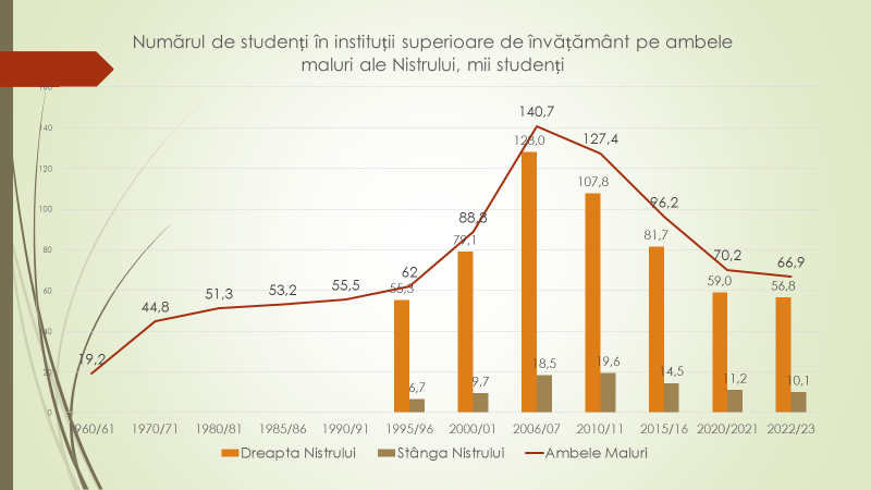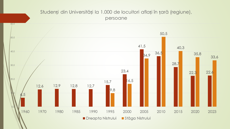 Studenți la o mie de locuitori. În perioada sovietică, Moldova avea 6 studenți la o mie de locuitori. Până în 1990, s-a stabilizat la 13 studenți la o mie de locuitori. Către 2005, malul drept avea 41,4 studenți la o mie de locuitori, iar stânga Nistrului – 34,9. Către 2010, malul drept avea 36,5, iar malul stâng – 50,5. În 2020 s-a ajuns că malul drept avea 22,3 studenți la o mie de locuitori, iar malul stâng – 35,8. În 2023/2024, malul drept are 22,6 studenți la o mie de locuitori, iar malul stâng – 33,6. „Parcă cifrele arată bine, dar situația este una foarte proastă. Pe ambele maluri ale Nistrului scade numărul de studenți în baza la doi factori: demografic, nu mai sunt copii; și migrația. Noi avem 50 de mii de studenți în țară și 30 de mii peste hotare. Studenții de pe malul stâng nu au alte oportunități de a merge la studii. Nu cunosc limba română, nici alte limbi nu cunosc. Mecanismul lor de studii nu le permite decât să meargă în Federația Rusă să studieze. Din acest motiv, numărul mare de studenți care este pe cap de locuitor în stânga Nistrului, denotă faptul că ei sunt izolați, nu au unde pleca”.