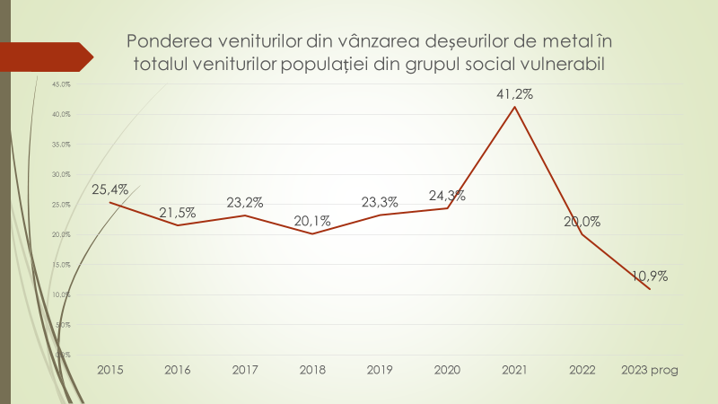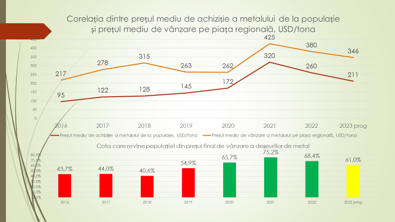 Expertul a mai spus că până în 2020, 25% din veniturile celor 40-45 de mii de familii, sau circa 5% din toate familiile din țară, proveneau din colectarea deșeurilor de metale. Aproape toate cheltuielile pe care le au pe timp de iarnă. În 2021, a fost 41%, iar în acest an, vor fi mai mici, circa 10%. „În 2018, când metalul se cumpăra cu 315 dolari/tona, cetățeanul primea la vânzarea metalului 128 de dolari/tona. În 2019, cetățenii primeau 145 de dolari per tonă la vânzare din 262 de dolari/tona la cumpărare. În 2020, după ce a fost liberalizată piața metalelor, legislația a fost modificată și a apărut concurența pe piață, la cumpărare metalul era 262 de dolari/tona, atunci la vânzare cetățenii primeau 172 de dolari/tona. În 2021, din 425 de dolari per tonă cât era la cumpărare, cetățenii care vindeau fier primeau 320 de dolari/tona”, a afirmat expertul.
