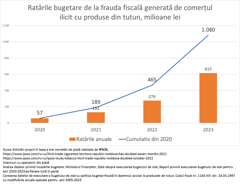 Pentru acest an, 2023, se estimează că piața ilegală a produselor de tutun va atinge cota de 12,3%, ceea ce este aproape dublu față de cota medie anuală din 2022, când a constituit 6,9%, și de 3,3 ori mai mult față de anul 2021, când comerțul ilicit cu produse de tutun a fost de 3,7%. Anul 2020, este anul de referință, când în Republica Moldova s-a declanșat acest fenomen extrem de negativ și piața ilicită a comerțului cu produse de tutun a fost estimată la 1,8%. Ratările bugetare din acest an, cauzate de comerțul ilicit , este estimat la 615 milioane lei, mai mult decât precedenții trei ani luați împreună.