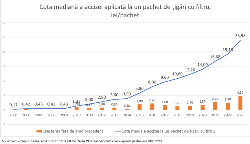 Republica Moldova, în baza angajamentelor internaționale, majorează consecvent cota accizelor la produsele de tutun. Astfel, doar în ultimii trei ani, acciza minimă aplicată la un pachet de țigări a crescut cu 7 lei, de la 14 lei în 2020 la 24 lei în 2023.