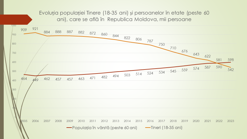 Potrivit expertului, persoanele de la 18 la 35 de ani sunt elementul puternic al societății pentru stabilitatea economică a țării. În 2005/2006 erau, în țară, de două ori mai mulți tineri decât persoane în vârstă. Erau 900-920 de mii de tineri la 450-460 de mii de persoane în etate. La fiecare persoană în etate reveneau doi tineri. După, situația a început să degradeze. Numărul tinerilor a scăzut vertiginos din cauza demografiei în scădere și a migrației. În 2022, în Republica Moldova, pentru prima dată, numărul tinerilor a fost mai mic decât numărul de persoane în etate. Au fost 581 de mii de tineri la 590 de mii de persoane în etate. Cu părere de rău, și în următorii ani, acest lucru va continua. Astăzi, 2023, sunt circa 600 de mii de persoane în etate la 540 de mii de tineri. Numărul persoanelor tinere, formate profesional pentru a lucra activ pentru societate, scade vertiginos.