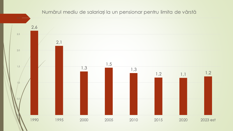 Economistul a mai menționat că în anul 1990, unui pensionar îi revenea 2,6 lucrători. 5 persoane lucrau pentru 2 pensionari. Atunci era posibil să fie plătită și o pensie adecvată. În 1995 deja raportul era de 2,1, iar în 2000 s-a ajuns la 1,3. Către 2005 situația un pic s-a îmbunătățit, ajungând-se la raportul de 1,5. Atunci, s-a implementat prima etapă a reformei și a început a crește vârsta de pensionare. Astfel fiind redus din numărul de pensionari. După aceasta, situația a început din nou a se înrăutăți. După 5 ani de creștere a vârstei de pensionare, s-a ajuns din nou la raportul de 1,3 către 2010. După 2010, situția a degradat continuu până la 1,1 în 2020. Acum este o creștere ușoară de până 1,2, dar fără speranțe de durată. „Situația în 2023 va fi mai proastă decât se aștepta. Datorită condițiilor de trai și a calității vieții mai bune, persoanele în etate trăiesc mai mult și numărul lor crește. Ei mai puțin pleacă peste hotare, iar dacă au plecat, când trec de 60-65 de ani se întorc acasă. Tinerii, din păcate, pleacă și, în prezent, practic în țară avem tineri, care sunt forța de muncă, mai puțini decât cei care deja au plecat”, a menționat economistul.