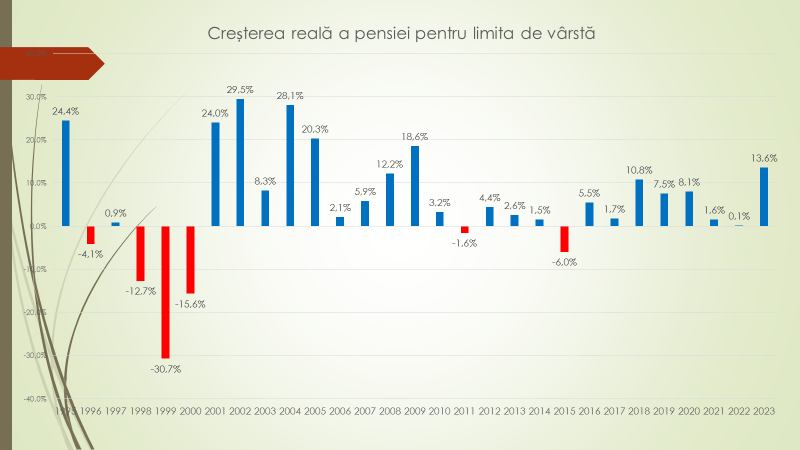 Expertul mai susține că anul trecut, din cazua inflației mari, pensia în valori reale,  a crescut cu doar 0,1%. Toată majorarea realizată anul trecut a fost erodată de rata inflației ridicată. Însă, și mai proastă situație a fost la salariații din economie, deoarece salariile lor au crescu mult sub nivelul inflației și veniturile lor reale în 2023 au înregistrat o scădere considerabilă. Veniturile populației, anul trecut, au fost mai mici decât în 2021. În acest an, cel mai probabil pensia reală, ținând cont de indexare, de toate majorările, dar și ținând cont că inflația va fi mică până la sfârșitul anului, va crește cu 13,6%. Ultima dată a fost așa ceva în 2009, când au fost alegeri, ca și în acest an. Atunci Guvernul, în speranța că va câștiga, mult peste ceea ce spunea legea, au indexat pensia cu 20%. Media anuală a fost de 18,6%. „Perioada anilor 1998-2000 ai fost cei mai negri ani din istorie pentru pensionari. Trei ani la rând pensia lor reală a scăzut cu 12,7%, 30,7% și cu 15,6%. Pensionarii noștri, cât de cât, au dus-o mai bine după 2001, 2002, 2004, 2005. Aveți grijă de pensionari că ei schimbă guverne. Atunci când pensia lor se înrăutățește, se schimbă guvernarea, iar guvernarea nouă înțelege lecția de la cea veche și face o majorare substanțială de pensie”, a opinat expertul.