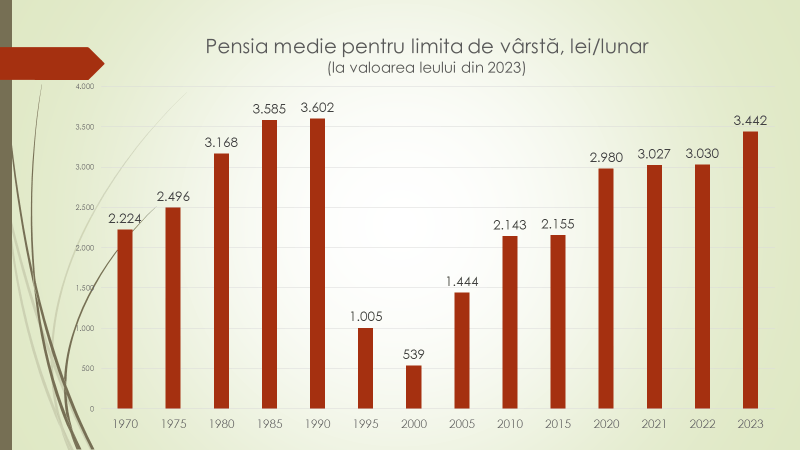 Economistul a amintit că în acest an, pensia medie va fi 3442 de lei. Anul trecut 3030 de lei. Cea mai proastă pensie a fost acordată în 2000, care la valoarea leului de astăzi a fost de 540 de lei. Cea mai bună pensie a fost acordată în perioada 1985-1990, când pensia a depășit 40% din salariul mediu, și era echivalentul a 3600 de lei la valoarea leului de astăzi. Către 2000, bunăstarea pensionarilor, față de 1990, a scăzut de 7 ori. În 10 ani au devenit de 7 ori mai săraci. Din 2000 și până în 2023, în 23 de ani, aproape că am reușit să recuperăm căderea din perioada 1990-2000. Cel mai probabil, doar anul viitor, pensia medie din Republica Moldova, ca putere de cumpărare, va fi mai mare decât a fost în 1990. Dacă salariul mediu a fost depășit câțiva ani în urmă, față de maximum din URSS, în ceea ce privește pensia, încă ni s-a reușit să fie întors persoanelor în etate, statutul pe care l-a avut cândva.