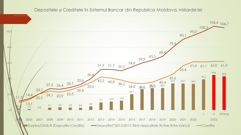 Expertul mai susține că din 2014, după jaful bancar, anual se înregistrează un surplus de bani în sistemul bancar. Până în 2014, volumul de credite era la nivelul volumului de depozite. După aceasta, până în 2022 ,volumul depozitelor a crescut constant, iar cel al creditelor a scăzut. „Am ajuns că în trimestru II din 2023 aveam un surplus de bani de circa 45 de miliarde de lei. Bani care stau în bănci neutilizați. Lucrul acesta arată cât de bolnavă este economia noastră. Sistemul nostru de creditare ar trebui să fie 60 % din PIB, dar este de 2 ori mai puțin și avem încă surplus de bani. Faptul că sunt bani în bănci care stau, asta înseamnă că economia noastră nu poate absorbi banii”, susține expertul.