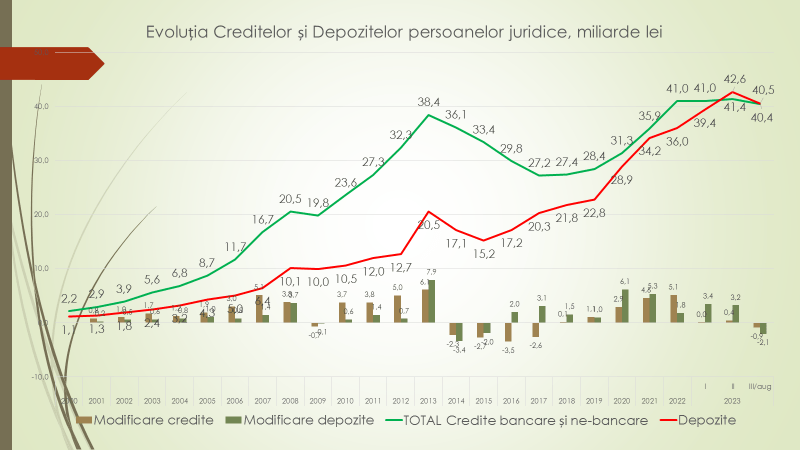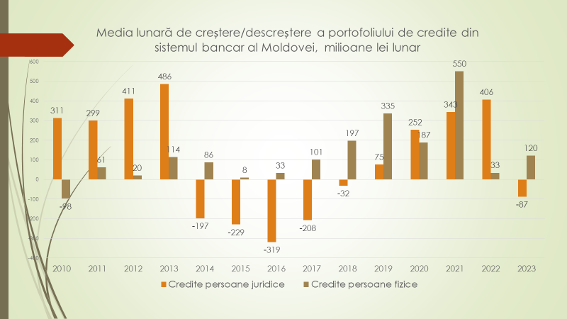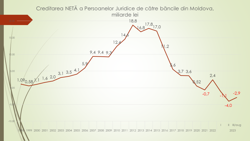Economistul a evaluat și câte credite au luat agenții economici din bănci, dacă nu sunt luate în considerare depozitele. În 2011, volumul creditelor era cu 18,8 miliarde de lei mai mare decât volumul depozitelor. A fost cea mai puternică creditare netă a agenților economici de către bănci. După aceasta, în 2021, pentru prima dată o istorie, creditarea netă a înregistrat o valoare negativă de 700 de milioane de lei. În 2022 a ajuns din nou pozitivă, iar în acest an, 2023, s-a ajuns în trimestrul II la minus 4 miliarde de lei, iar în trimestrul III la la minus 2,9 miliarde de lei.