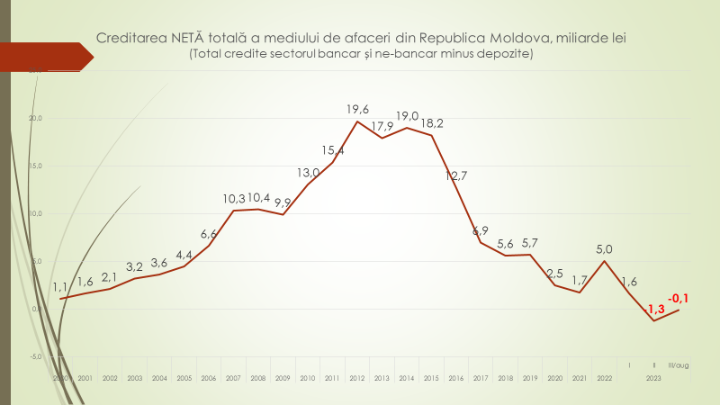 Potrivit expertului, creditarea netă totală este volumul total de credite accesat de către agenții economici de la bănci, minus volumul depozitelor. Banii luați de la bănci, minus banii pe care îi țin în bănci. Creditarea netă arată cât de vie și de sănătoasă este activitatea economică a unei țări și dacă agenții economici investesc sau nu în economia țării. „În cazul Republicii Moldova, economia suferă deoarece agențiilor economici au frica de a face investiții, de a începe proiecte investiționale, aceștia își depozitează banii în bănci, dar nu i-au credite noi pentru afaceri și dezvoltare. Trăim într-o economie care generează anual exodul 30 de mii de oameni din țară. Modul în care ne dezvoltăm, numai dezvoltare nu se cheamă și modul cum acționăm până în prezent, numai nu încurajează un mediu investițional atractiv”, a declarat expertul.